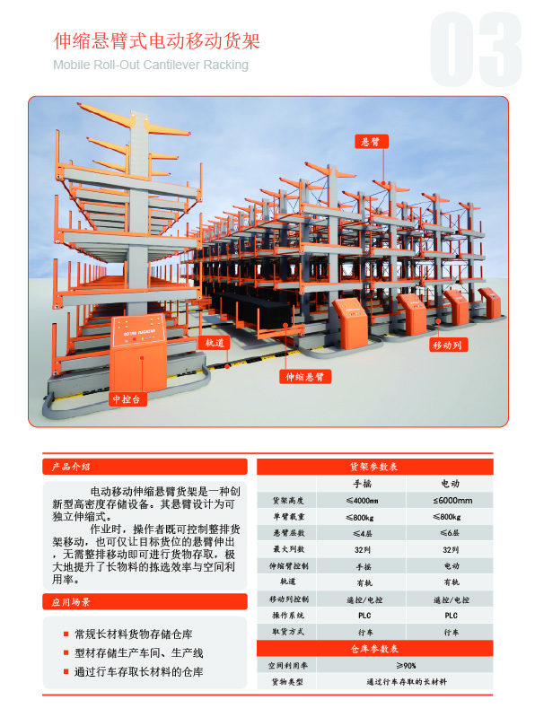 电动移动伸缩悬臂货架是一种创新型高密度存储设备。其悬臂设计为可独立伸缩式。