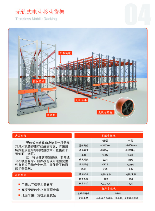 无轨式电动移动货架是一种无需预埋地轨的密集存储解决方案。它采用特殊的承重与导向底盘技术,直接在平整地面上运行。